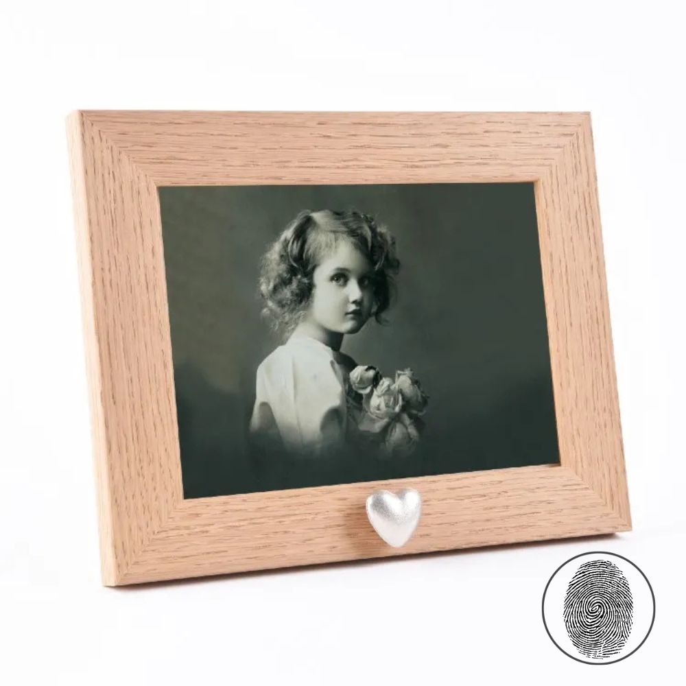 Een vingerafdruk van uw dierbare plaatsen wij graag op het hartje, zo maakt u deze fotolijst een persoonlijk aandenken. Het digitale bestand kunt u tijdens de bestelling eenvoudig uploaden.