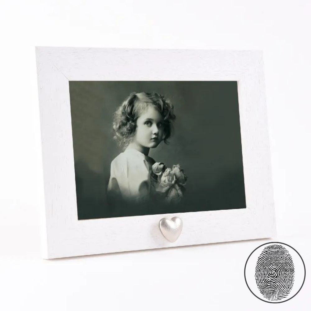 Een vingerafdruk van uw dierbare plaatsen wij graag (meerprijs) op het hartje, zo maakt u deze fotolijst een persoonlijk aandenken. Het digitale bestand kunt u tijdens de bestelling eenvoudig uploaden. Let op,  de graveerstudio heeft hiervoor wel een extra week nodig.