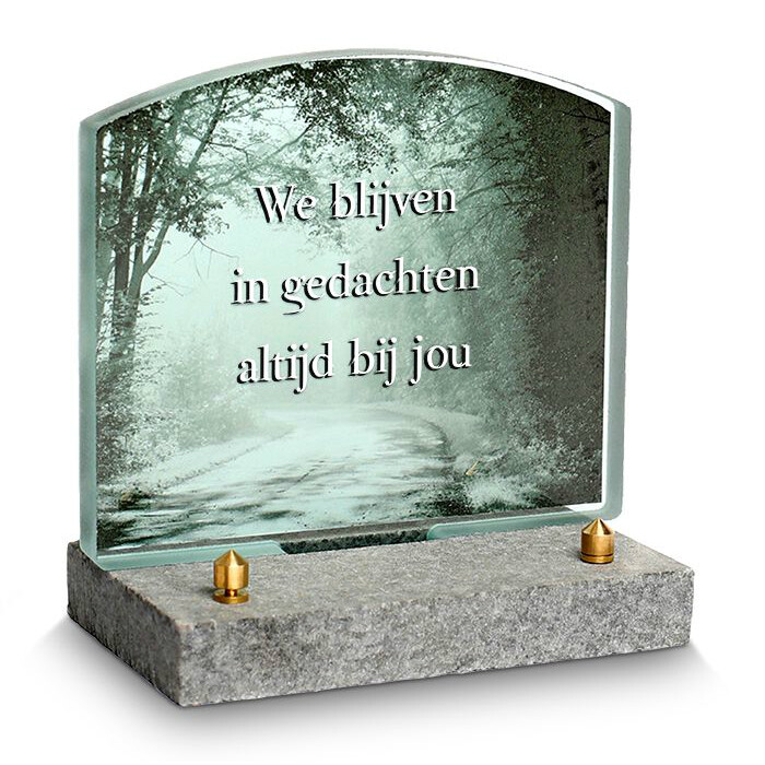 Een mooie tekst in glas vereeuwigd op een graniet voetstuk. Het glasmonument met voorbeeld tekst meet 12x14cm met een ronding aan de bovenzijde. Wij tonen u verschillende voorbeeld teksten, maar uw eigen tekst of een mooi gedicht met eigen foto is ook mogelijk (meerprijs). Wij maken voor u graag een proefdruk.