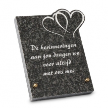 Gedenksteen Dubbel Hart: De herinneringen aan jou..... Deze gedenksteen met achtersteun heeft een mooie voorbeeld tekst maar kan ook voorzien worden van uw eigen persoonlijke tekst, een mooi gedicht of een herkenbare uitspraak van uw dierbaren.