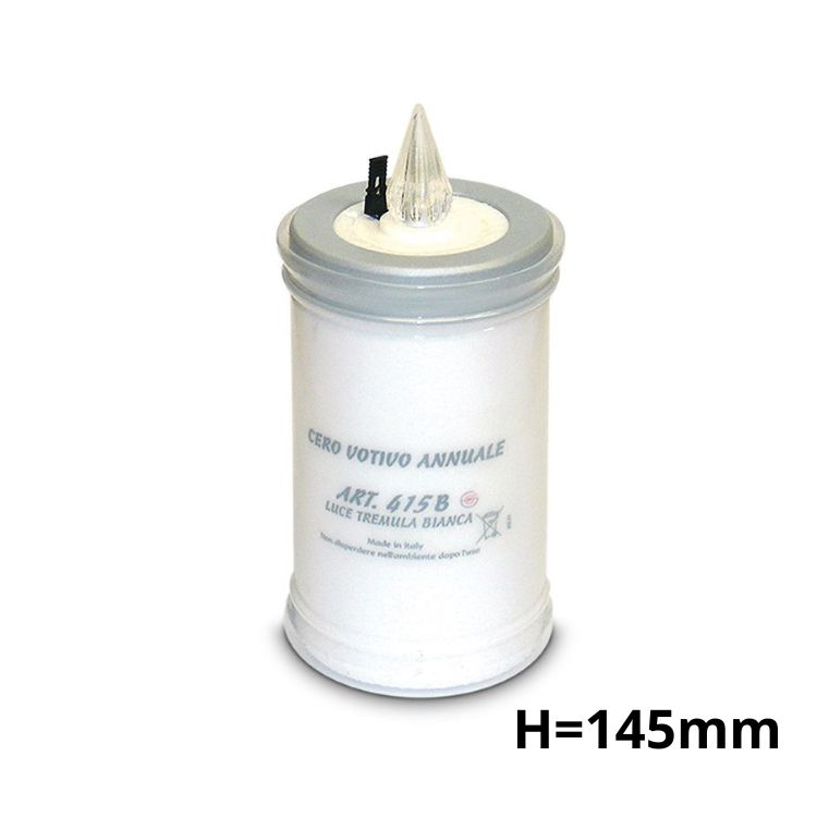 LED-kaars in wit plastic gevat. Deze kaars heeft een kleine batterij met een levensduur van ca. 365 dagen. De inwendige batterij is niet vervangbaar of oplaadbaar. De hoogte van deze kleine electrische vlam is 145mm. De kleur van de vlam is wit.