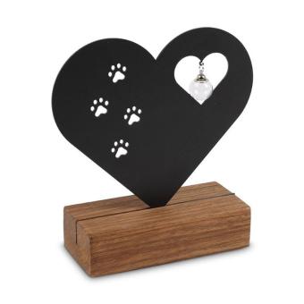 Deze urn is gemaakt van 2 mm gecoat staal. De sokkel is van hout en voorzien van een askamer. Hierin kunt u het bijgeleverde (optionele)  as-busje plaatsen, waarna u deze vervolgens kunt sluiten met het bijgeleverde aluminium plakrondje. Onze huisdieren zijn heel belangrijk, ze zijn onze maatjes en die willen we graag op eervolle manier gedenken. Met deze achterliggende gedachte is dit gedenkbeeld voor huisdieren ontworpen en gemaakt. Wij maken thuis vaak een gedenkhoekje met verschillende items die herinneren aan onze trouwe viervoeter.  Dit gedenkbeeld voor dieren is zo ontworpen en gemaakt dat je aan het haakje heel gemakkelijk een as-sieraad of penning kan hangen. Een as-hanger kun je dragen of in dit gedenkbeeld hangen. Dit gedenkbeeld voor dieren is dan ook te decoreren naar persoonlijke wens.