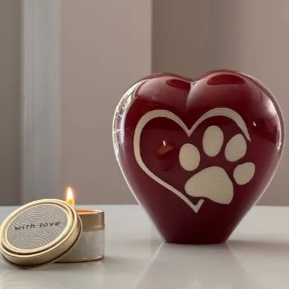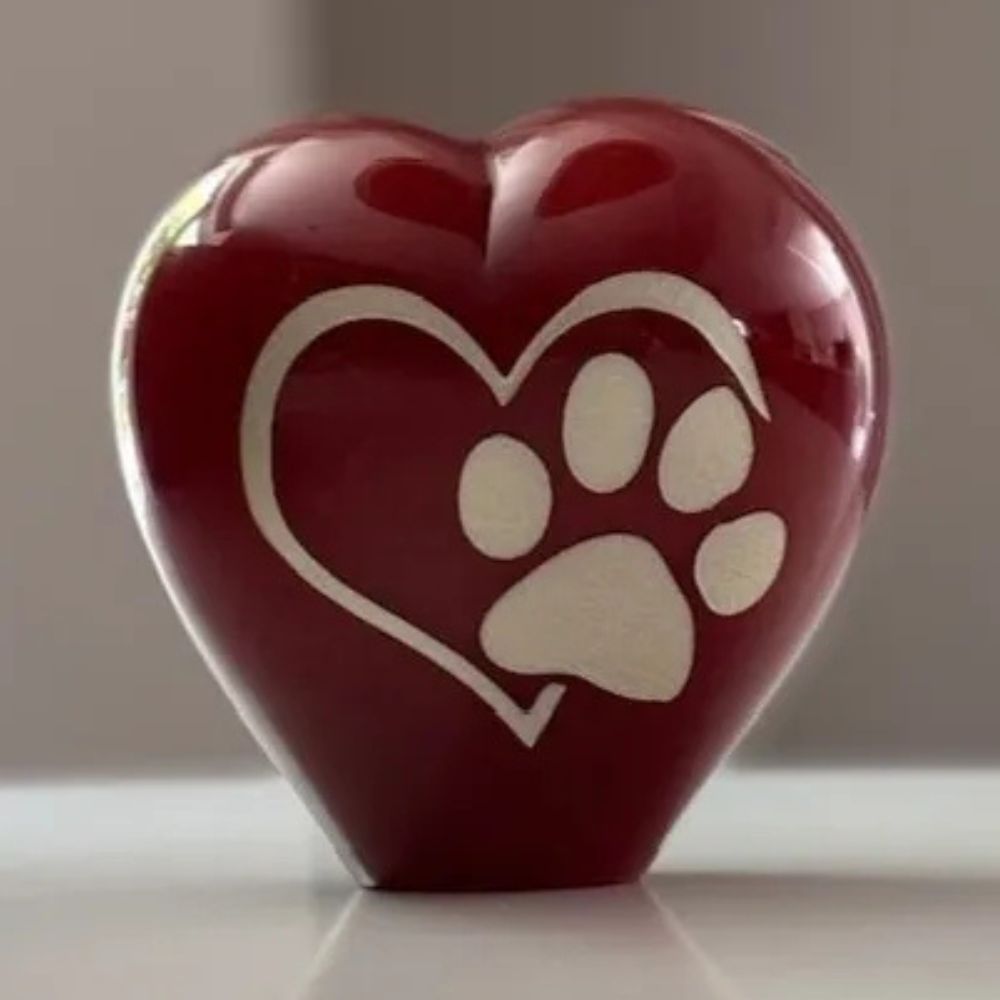 Een Hart urn in Rood kristalglas, rondom gezandstraald met afbeelding van een Pootafdruk gecombineerd met een Hartje. Deze kleine urn is 12cm hoog, de inhoud is ca. 400ml. De urn is eenvoudig te voorzien van crematie-as van uw huisdier door een kleine opening aan de onderzijde.