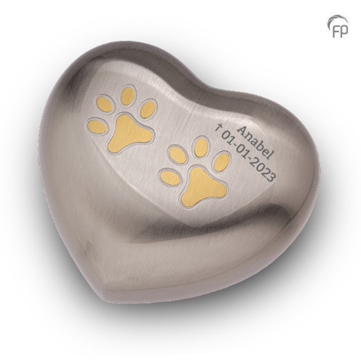 Hart mini urn geborsteld zilver met pootafdrukken in goudkleur