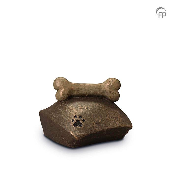 Deze dieren-urn met een kluif is vorm gegeven door de kunstenaar Geert Kunen en exclusief vervaardigd voor Funeral Products, elke urn wordt met de hand geboetseerd uit hoogwaardige klei en vervolgens gedroogd en gebakken in een oven van 1100 graden Celsius. Door deze ambachtelijke vervaardiging is elke urn een uniek exemplaar waarbij kleine verschillen kunnen ontstaat in kleur en vorm. Deze gebakken urn wordt voorzien van een dun laagje brons en nogmaals verhit tot boven het smeltpunt van brons. Hierdoor hecht de bronzen finish zich aan het keramiek. De urn verweerd na enige tijd waardoor een mooi patina (oxidatielaagje) ontstaat.