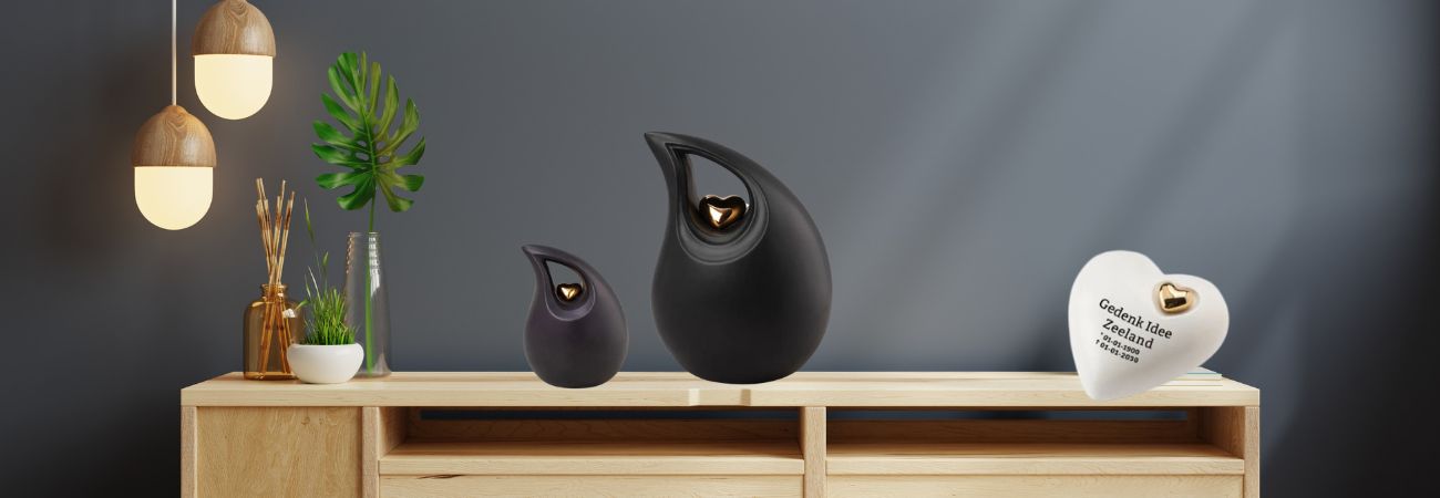 Keramiek urn in matzwart met goudkleurig hart (800ml). Een veel voorkomende urnensoort is gemaakt van keramiek. Voor de vervaardiging van deze keramische urnenset KU004 van Funeral Products worden speciaal geselecteerde ingrediënten gemixt om een keramische massa te vormen. Hiermee worden de modellen vormgegeven. De keramische urnen worden na het ba...