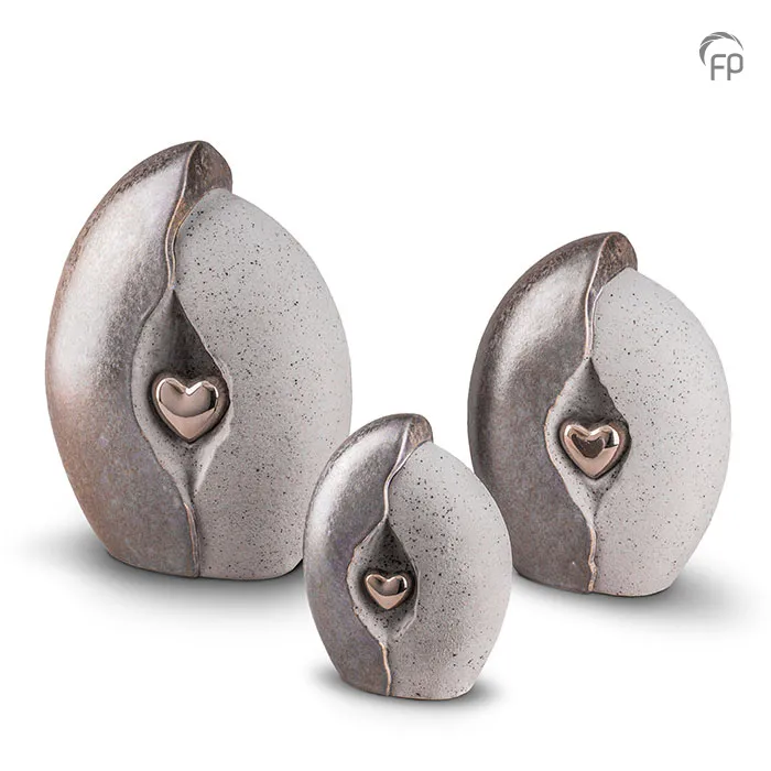 Keramiek urn in grijs met zilverkleurig hartje. Deze Mastaba urnen van Funeral Products zijn leverbaar in 3 formaten en uitsluitend geschikt voor plaatsing binnenshuis. De asbestemming wordt geplaatst via de onderzijde en afgesloten met een dekseltje.