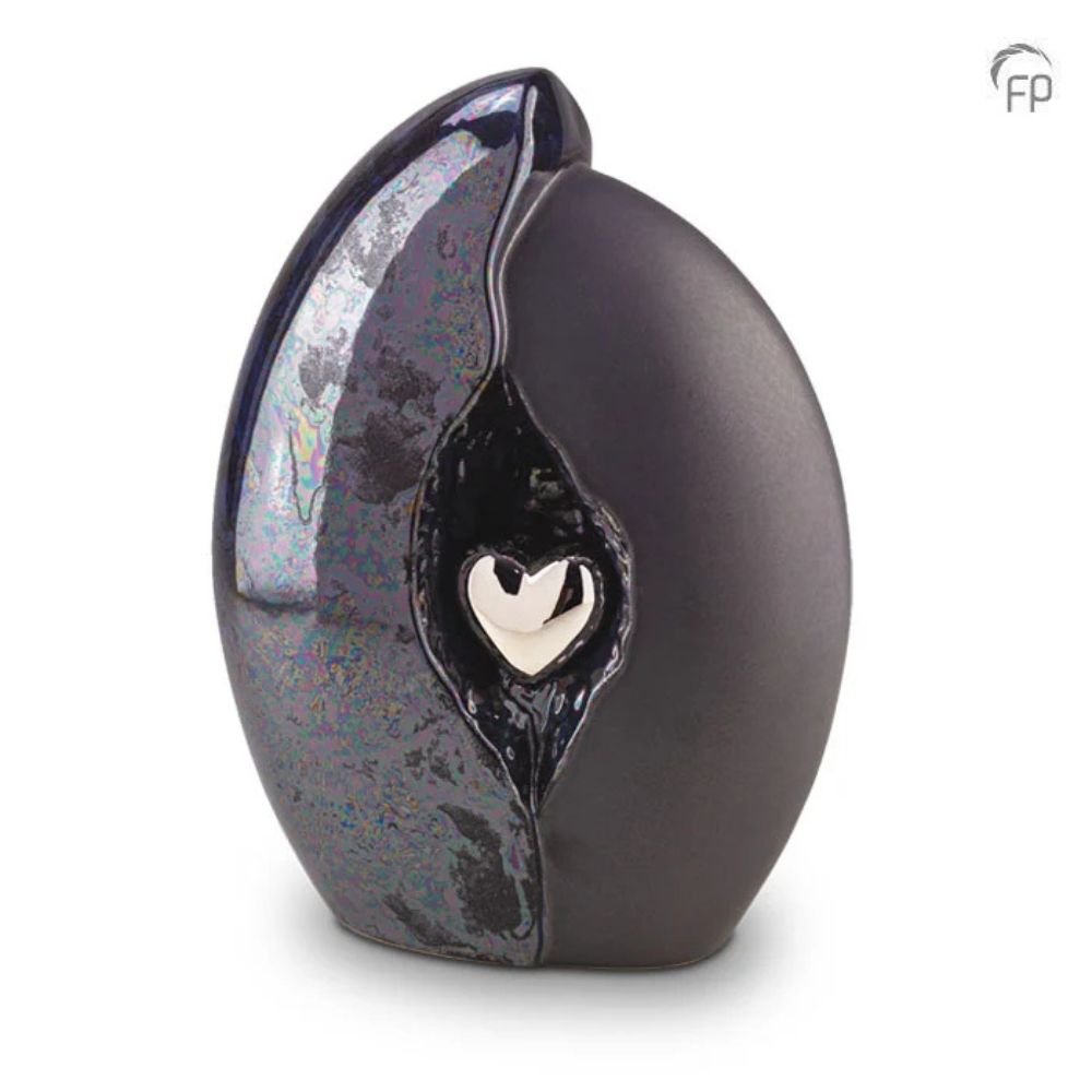 Keramiek urn in grijsblauw met zilverkleurig hartje. Deze Mastaba urnen van Funeral Products zijn leverbaar in 3 formaten en uitsluitend geschikt voor plaatsing binnenshuis. De asbestemming wordt geplaatst via de onderzijde en afgesloten met een dekseltje.