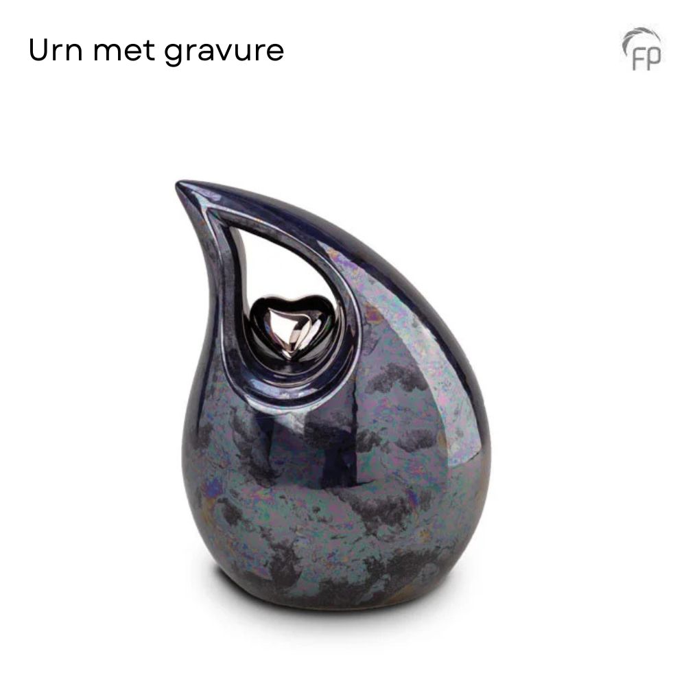 Traan urn zwartblauw keramiek met zilverkleurig hartje + gravure
