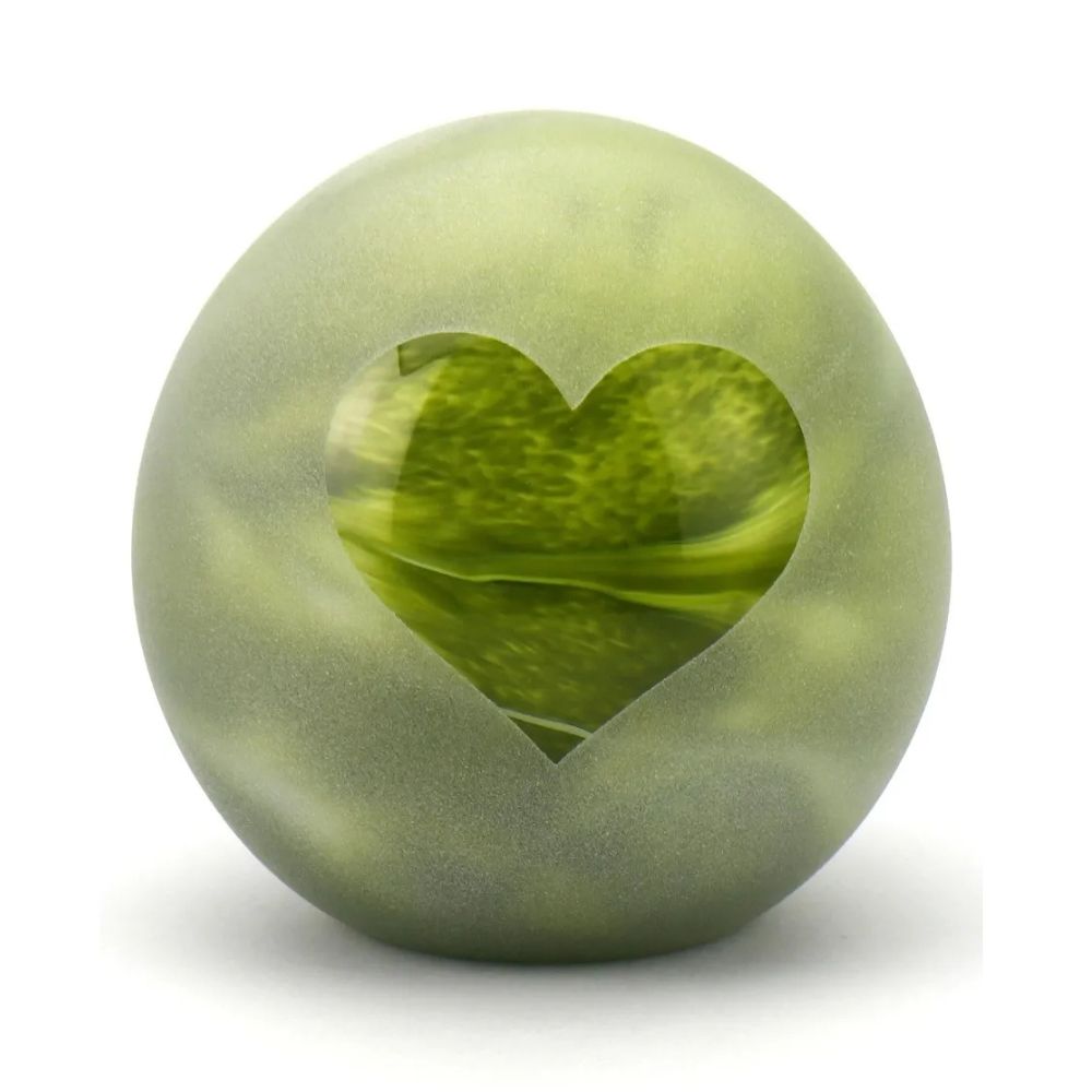 Een vol ronde urn geschikt voor een klein beetje crematie-as, een haarlok of een stukje kleding als aandenken aan uw dierbare. Met een zelf-hechtend sluitplaatje aan de onderzijde wordt het as-reservoir afgesloten. Deze unieke groene Frosted urn heeft een liefdevol hart.