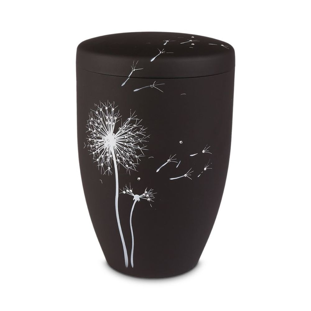 Antraciet urn met Paardenbloem en Swarovski steentjes.