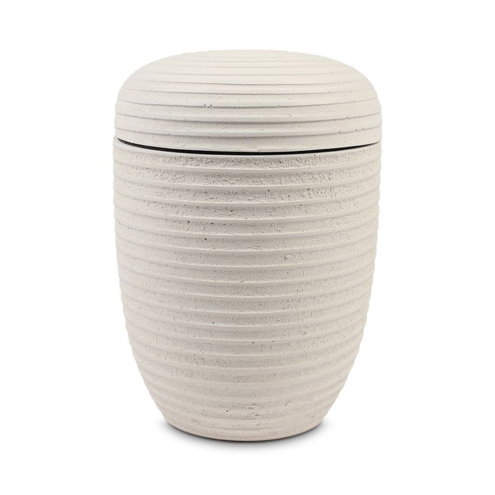 Urn in Beige calcium met geribbelde buitenzijde. De urn is gemaakt van Kalk, een natuurvriendelijke grondstof. De urn is prima geschikt voor plaatsing binnenshuis of in de grond buitenshuis. Na verloop van tijd zal deze urn met inhoud worden opgenomen in de aarde.