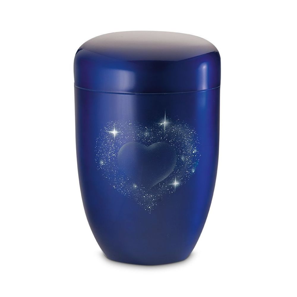 Urn in Blauw edelstaal gedecoreerd met een mooi Hart omgeven met Sterren. De inhoud van deze edelstalen urn is ongeveer 4500ml, dat maakt de urn geschikt voor de crematie-as voor personen tot ca. 135kg.