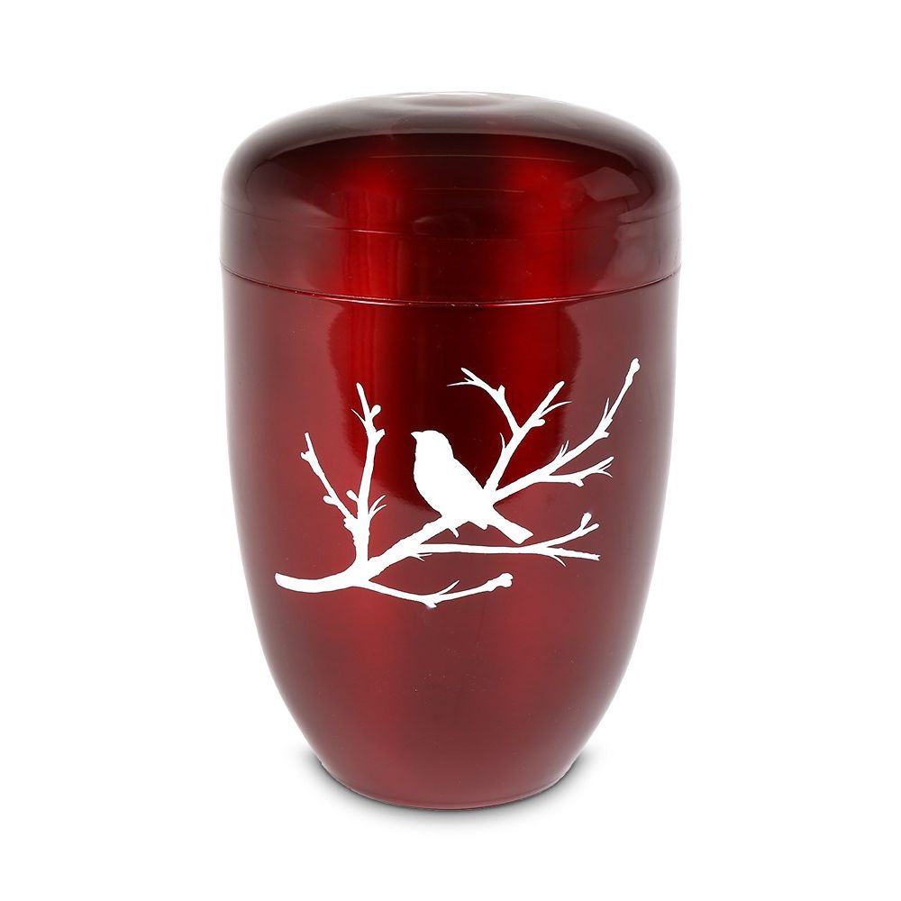 Urn in Bordeauxrood edelstaal gedecoreerd met een witte vogel op een tak. De inhoud van deze rode urn in hoogwaardig edelstaal is 4000ml en geschikt voor de crematie-as voor personen tot ca. 125kg.