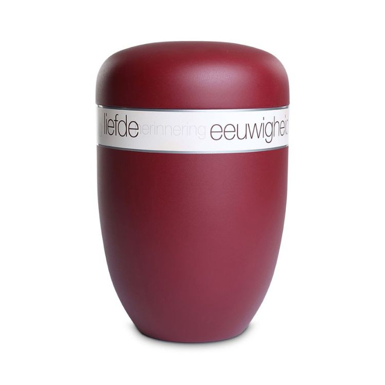 Urn van hoogwaardig edelstaal met tekstband Eeuwigheid, liefde en herinnering. Deze rode urn heeft een inhoud van ca. 4 liter en is hoog 26 cm. Het model is leverbaar in verschillende kleuren bij Gedenk Idee Zeeland.