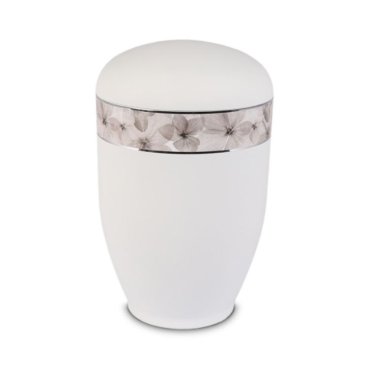 Urn van edelstaal kleur Mat-Wit met Bloemen decorlint. Een mooi en nieuw model urn met een mat-witte ondergrond. De inhoud van deze urn van edelstaal is 3500ml. De urn is geschikt voor de crematie-as voor personen tot ca. 115kg.