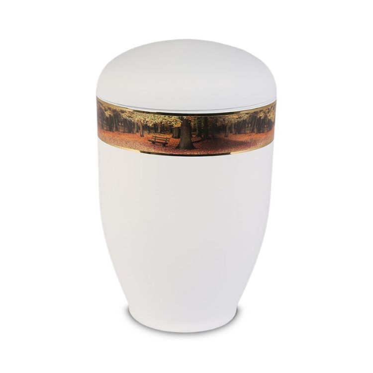 Urn van edelstaal kleur Mat-Wit met Bomen en een Bankje. Een mooi en nieuw model urn met een mat-witte ondergrond. De inhoud van deze urn van edelstaal is 3500ml en geschikt voor de asbestemming voor personen tot ca. 115kg.