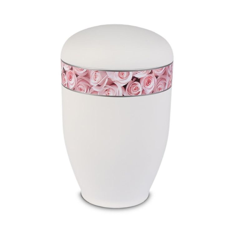 Urn van edelstaal kleur Mat-Wit met Rozen. Een mooi en nieuw model urn met een mat-witte ondergrond. De inhoud van deze urn van edelstaal is 3500ml. De urn is geschikt voor de crematie-as voor personen tot ca. 115kg.