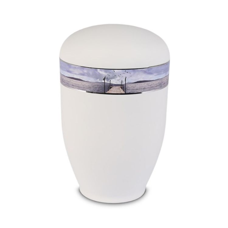 Urn van edelstaal kleur Mat-Wit met Zeesteiger. Een mooi en nieuw model urn met een mat-witte ondergrond. De inhoud van deze urn van edelstaal is 3500ml is geschikt voor de crematie-as voor personen tot ca. 115kg.