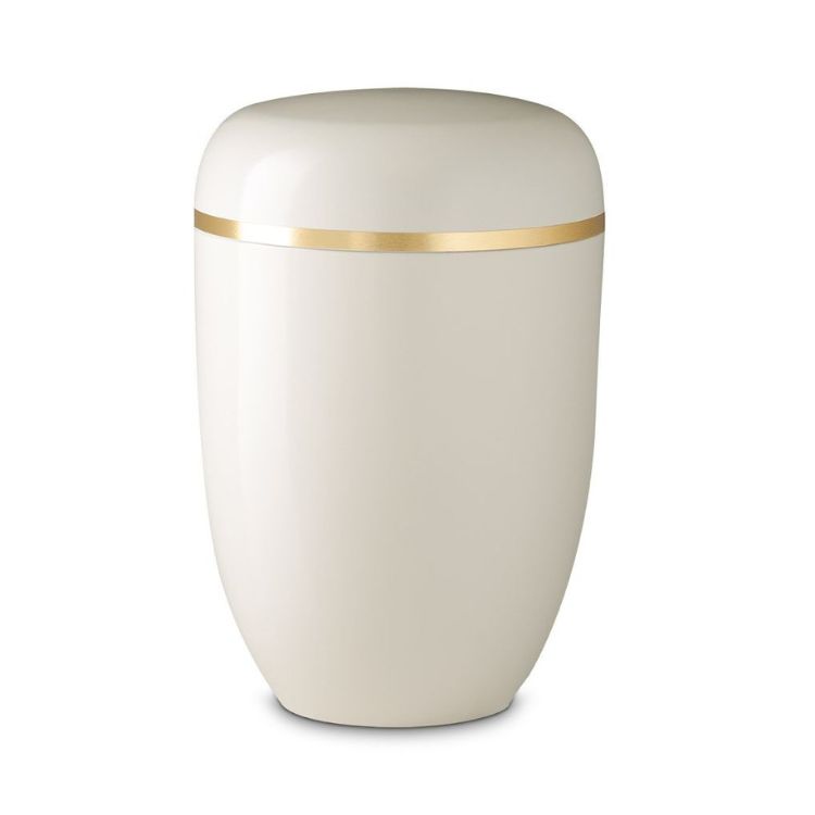 Urn in Crème-wit edelstaal met decorband in goudkleur.