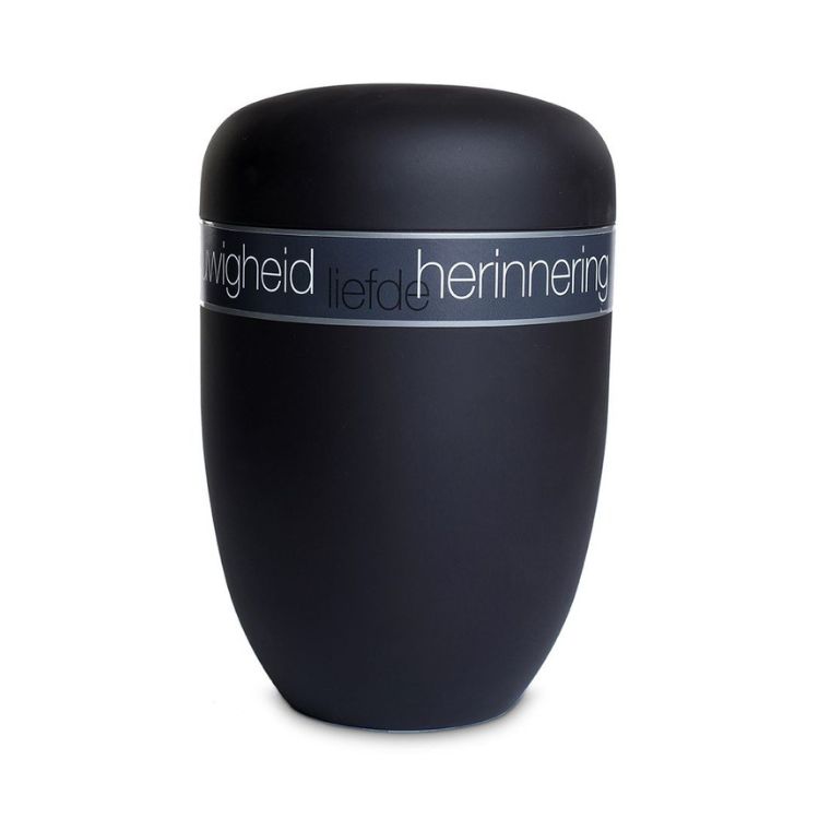 Urn van hoogwaardig edelstaal vervaardigd met tekstband Eeuwigheid, liefde en herinnering. Deze matzwarte urn heeft een inhoud van ca. 4 liter en is hoog 26 cm. Het model is leverbaar in verschillende kleuren bij Gedenk Idee Zeeland.