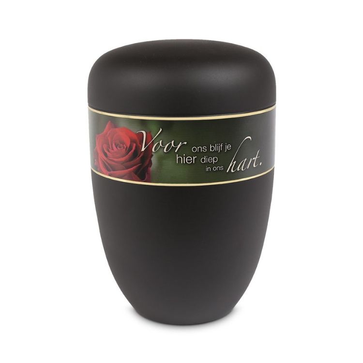 Deze urn is vervaardigd van hoogwaardig edelstaal en van Duits fabrikaat. De mat-zwarte urn is gedecoreerd met een tekstband met rozen: "Voor ons blijf je hier diep in ons hart". Dit model is leverbaar in twee varianten en uitsluitend geschikt voor plaatsing binnenshuis.