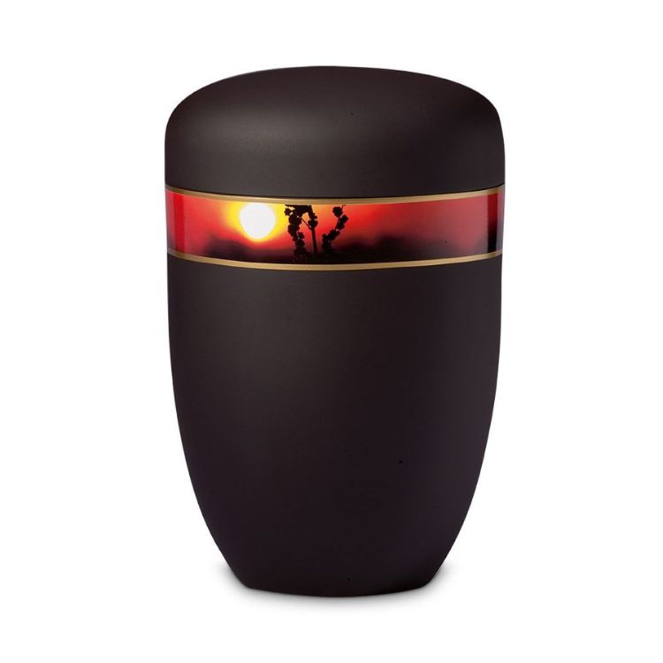 Urn vin matzwart edelstaal met een decorband Ondergaande zon. Deze urn heeft een inhoud van ca. 4000ml en is hoog 26cm. Het model is leverbaar in 4 verschillende decoraties bij Gedenk Idee in Zeeland. Levering is inclusief verzendkosten met PostNL