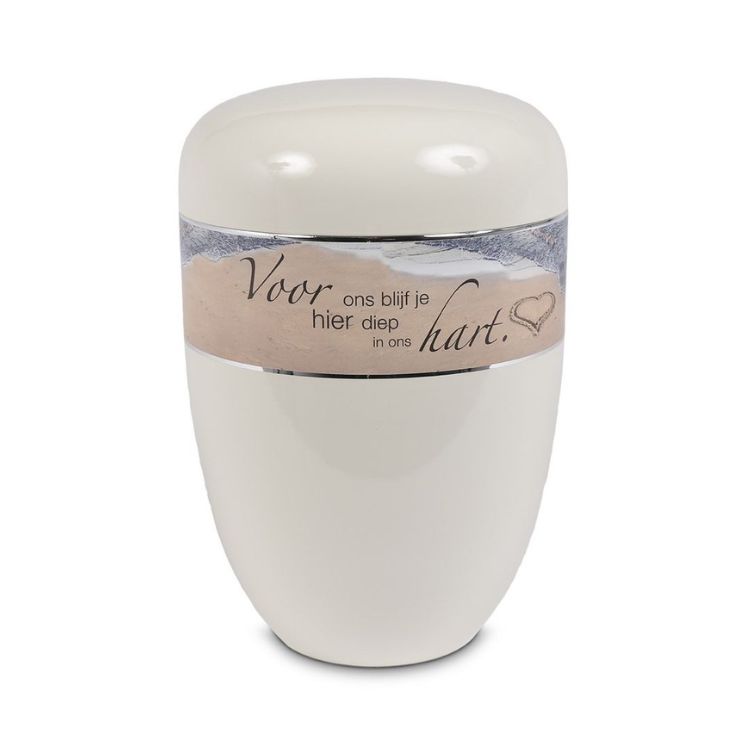 Deze urn is vervaardigd van hoogwaardig edelstaal met een tekstband: Voor ons blijf je hier, diep in ons hart. De kleur van de urn is creme-wit en de tekstband heeft een styrandachtergrond met een hart. De urn van edelstaal is uitsluitend geschikt voor plaatsing binnenshuis. Een urn van edelstaal is een betaalbaar alternatief voor de doorgaans vele en dure modellen, deze urn van edelstaal blijft lang mooi en wordt geleverd op uw adres in Nederland door PostNL voor 139 Euro inclusief verzendkosten met PostNL in Nederland.
