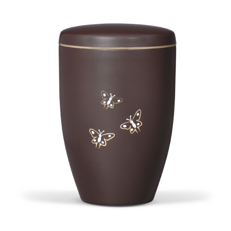 Deze urn is vervaardigd van hoogwaardig edelstaal met drie vlinders. De kleur van de urn is bruin met aan de bovenzijde een decorband in goudkleur. De urn van edelstaal is uitsluitend geschikt voor plaatsing binnenshuis. Een urn van edelstaal is een betaalbaar alternatief voor de doorgaans vele en dure modellen, deze urn van edelstaal blijft lang mooi en wordt geleverd op uw adres in Nederland door PostNL voor 109 Euro inclusief verzendkosten.