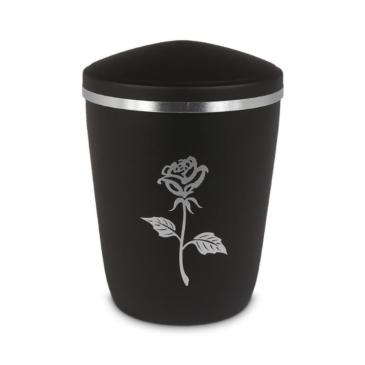 Urn van hoogwaardig edelstaal kleur zwart. Deze urn is gedecoreerd met een decorband in zilverkleur + roos. De inhoud van deze edelstalen urn voor plaatsing binnenshuis is ongeveer 3400ml met een hoogte van 22cm. De levering op uw adres in Nederland is inclusief verzendkosten voor 109 Euro.