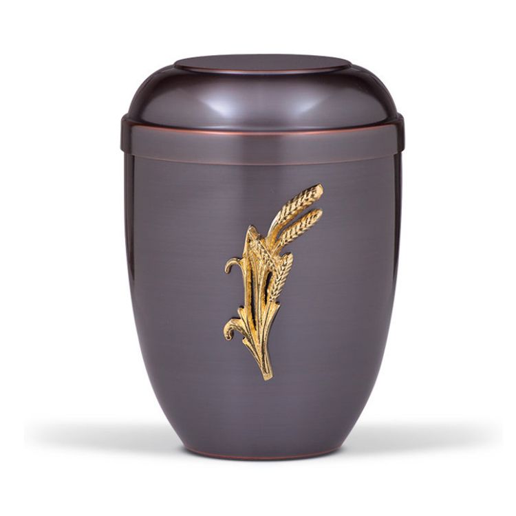 Urn van koper vervaardigd met een afbeelding van een graanschoof. Een klassiek model met formaat 26x18cm. De inhoud van deze koperen urn is 4000ml. De urn met een afgerond plat deksel is geschikt voor personen tot ca. 125 kg.