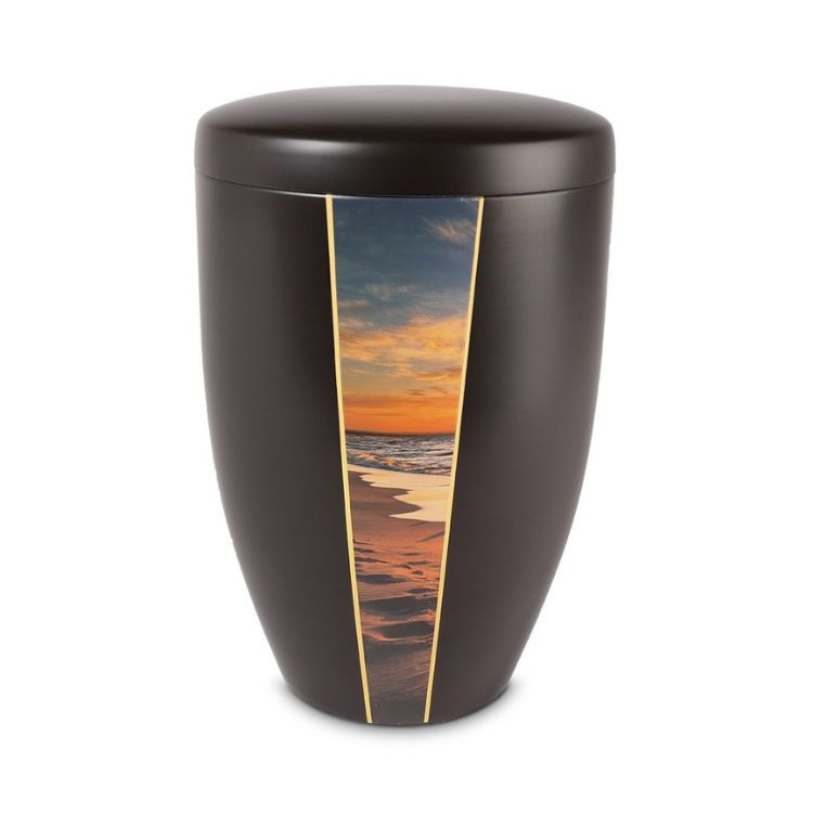 Urn in Zwart edelstaal kleur met decorlint Avondstrand. Een mooi en nieuw model urn met een zwarte ondergrond. Deze edelstalen urn heeft een grote inhoud van 5000ml en geschikt voor de crematie-as voor personen tot ca. 135kg.
