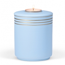 Een kleine urn in de kleur blauw met aan de bovenzijde een uitsparing voor een waxine. Een brandend kaarsje geeft extra aandacht voor uw dierbare welke u wilt gedenken. Het ronde urntje heeft een askamer voor ca. 400ml crematie-as. Dat is doorgaans een klein deel van de inhoud van de asbus welke u in ontvangst neemt bij het crematorium.