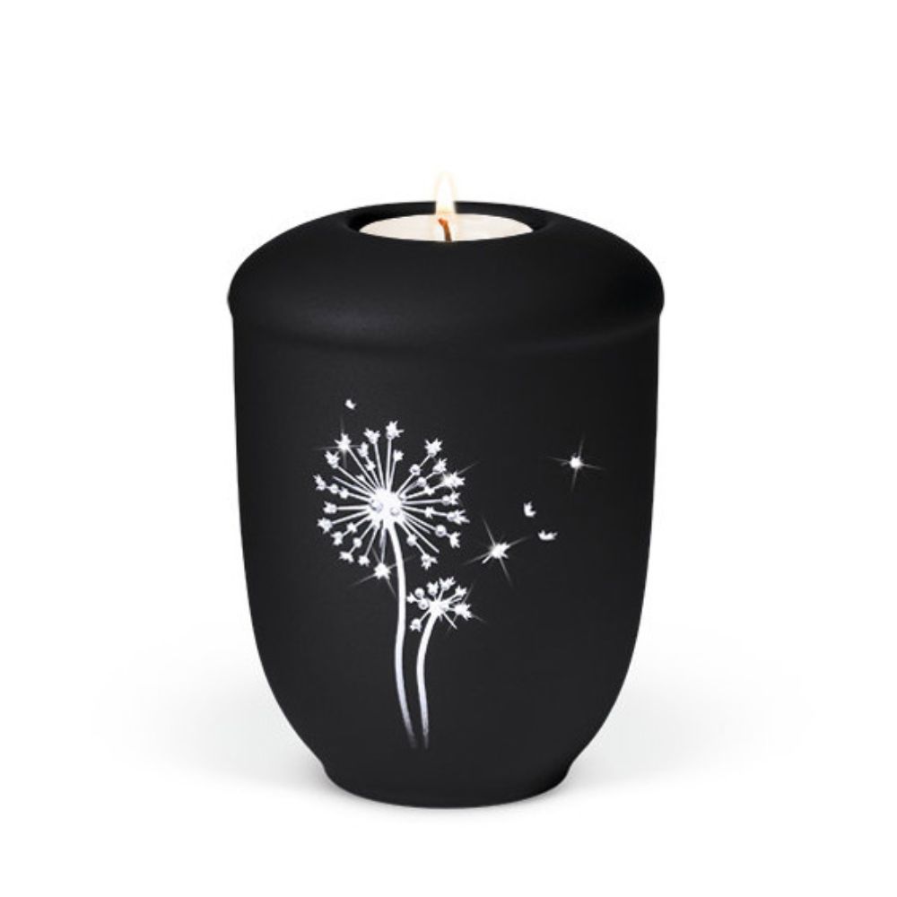 Waxine urn met Paardenbloem + Swarovski op antracietkleurig keramiek.